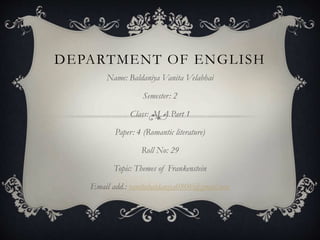 Vanita Baldaniya Velabhai is a second semester MA student writing a paper on the themes of Frankenstein by Mary Shelley for her Romantic literature class. The three main themes she will discuss are birth and creation, represented by Victor Frankenstein taking on the roles of woman and God in creating life, alienation experienced by both Victor and the monster, and the importance of family and domestic life. She will analyze how Shelley incorporated these themes in her novel and what they represented about issues of her own life and contemporary debates.