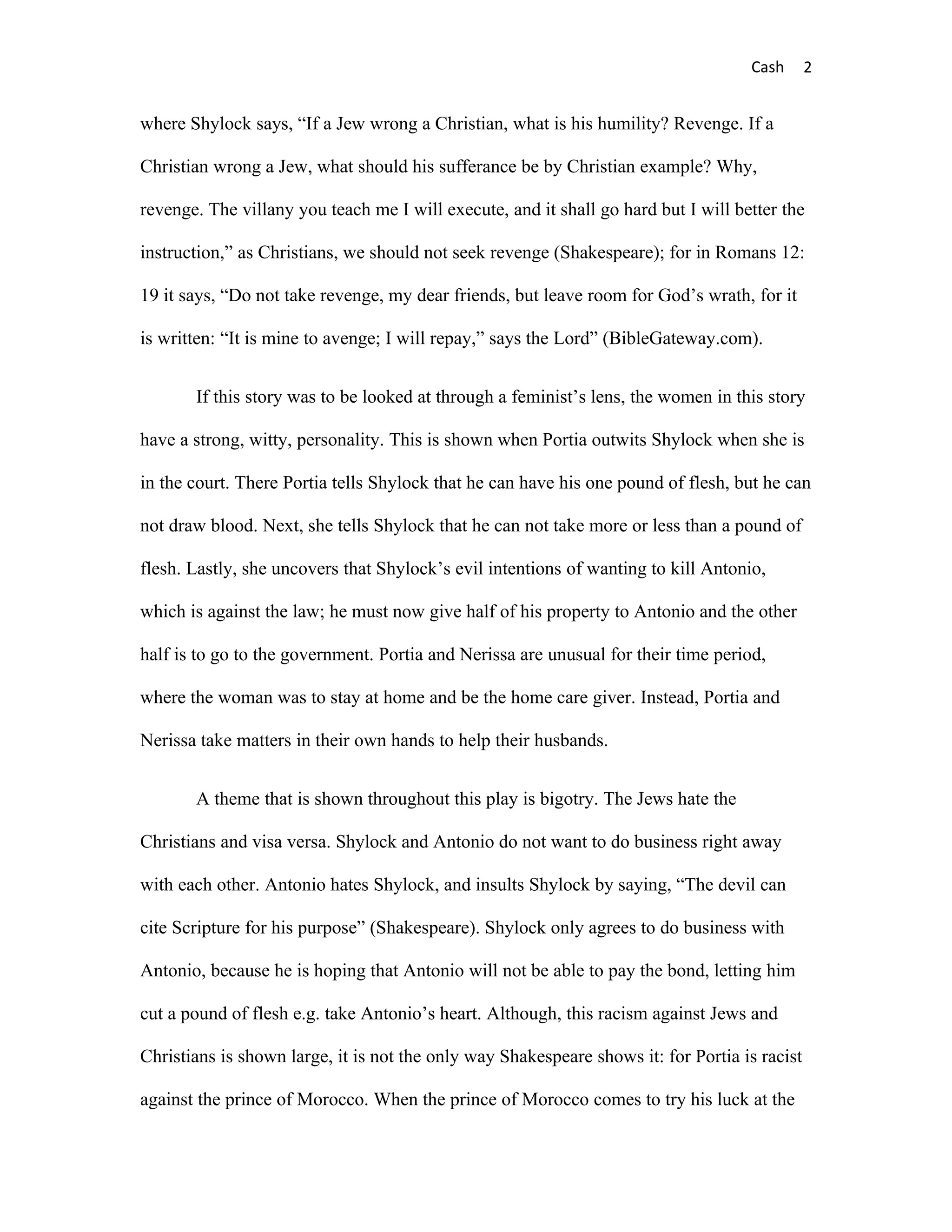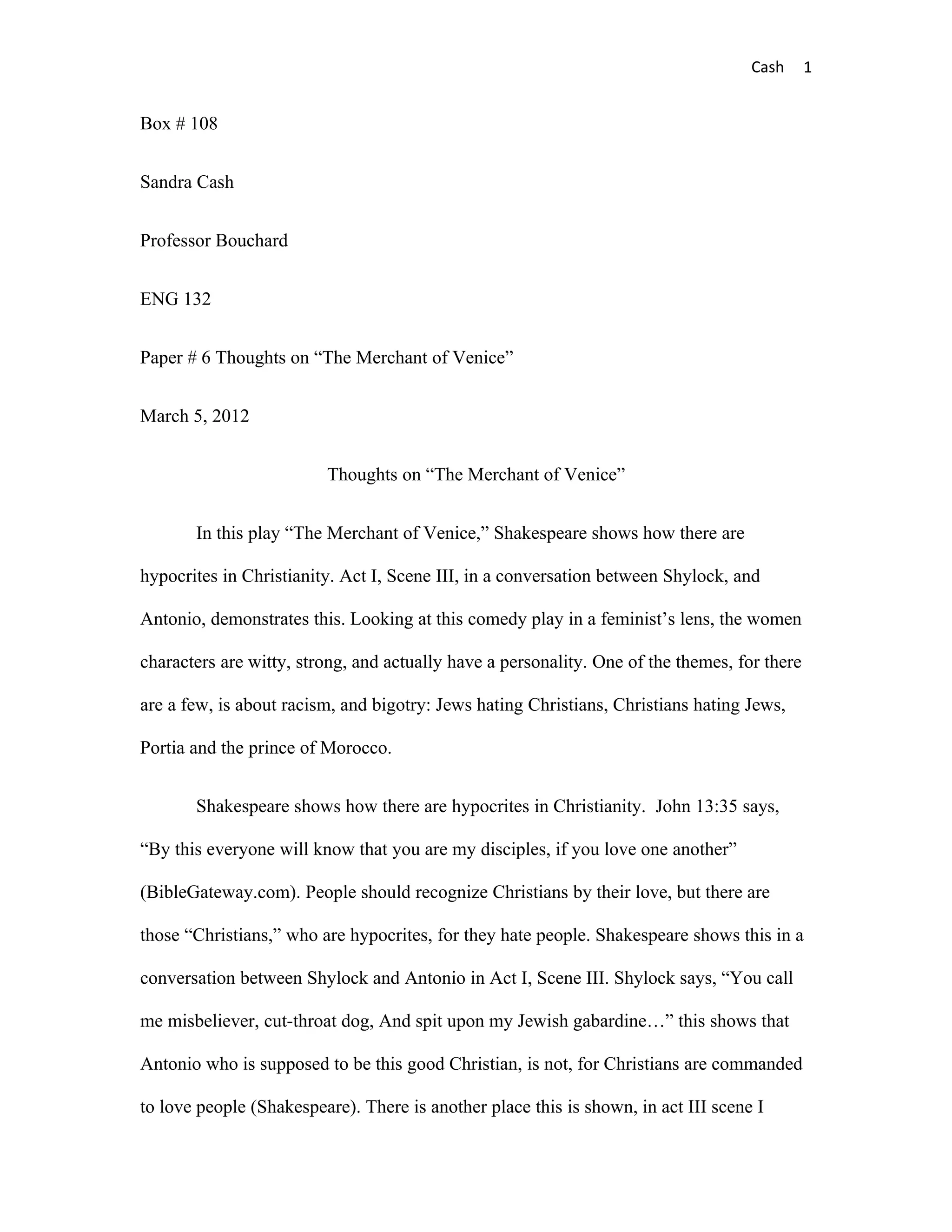 The document provides an analysis of themes in Shakespeare's play "The Merchant of Venice". It argues that the play depicts hypocrisy within Christianity through the interaction between Shylock and Antonio. It also discusses how the female characters of Portia and Nerissa challenge gender roles of their time by taking independent action. Additionally, it examines the theme of racism and bigotry in the relationships between Jews and Christians as well as Portia's initial reaction to the Prince of Morocco.