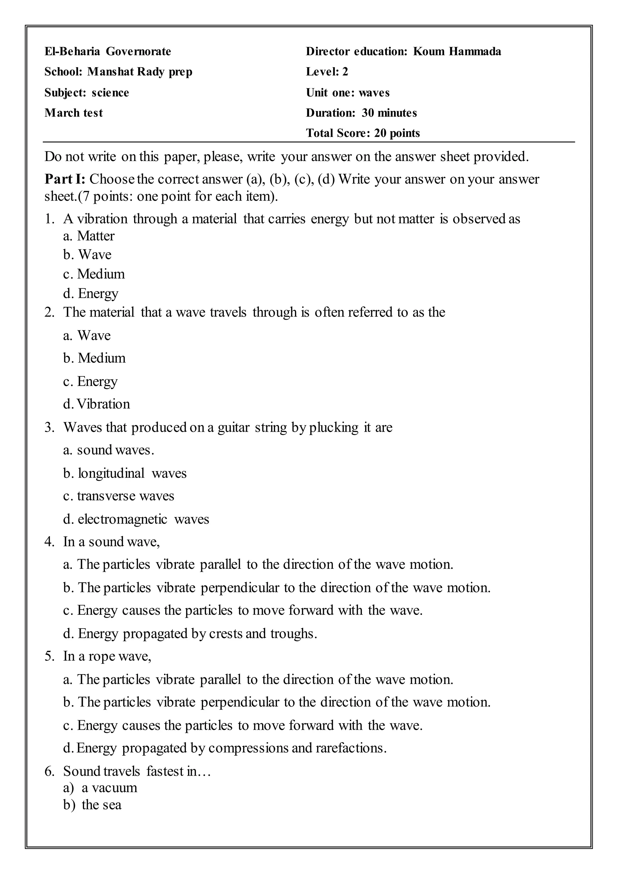 This document contains a science test on waves for a 2nd level prep school class. The test has three parts. Part I contains 7 multiple choice questions about wave properties. Part II has students match wave concepts to definitions and identify extra definitions. Part III requires calculating wavelength, amplitude, and velocity from a diagram of a water wave. The test has a total of 20 points and is to be completed in 30 minutes. An answer key is provided.