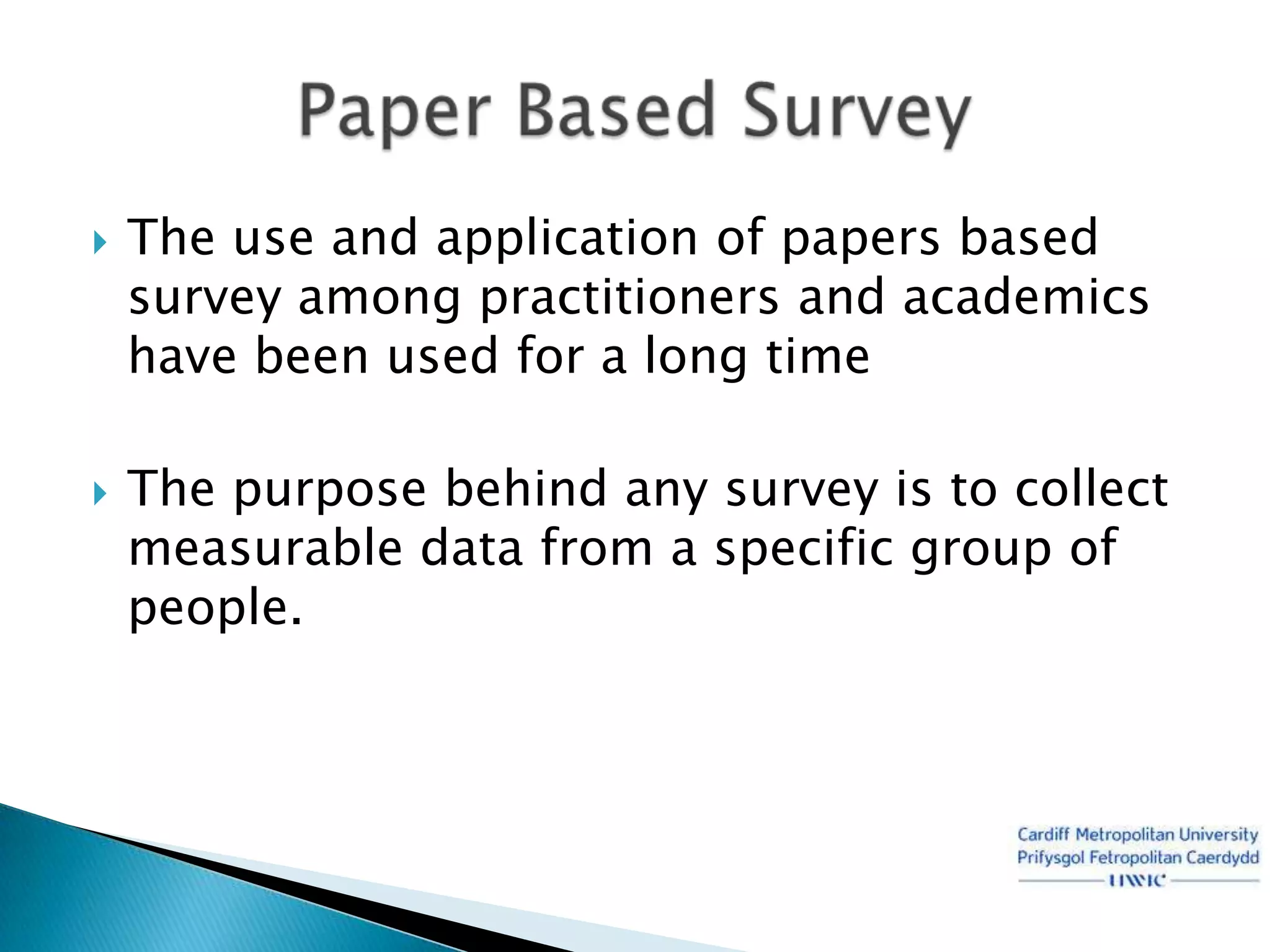 This document discusses the use of paper-based surveys for data collection. It outlines both the advantages and disadvantages of this approach. Some key benefits include flexibility, the ability to complete surveys anywhere, and assurances of confidentiality for respondents. However, paper surveys also have drawbacks such as higher costs, slower response rates, and increased data entry requirements. Overall, the document concludes that paper surveys remain an important research tool when matched to the needs of respondents.