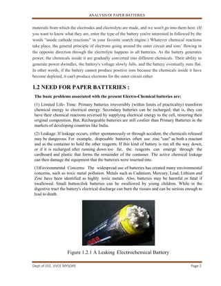 1. The document analyzes paper batteries, including their construction, working principles, and experimental details. Paper batteries combine cellulose paper with carbon nanotubes to act as flexible, thin energy storage devices.