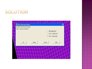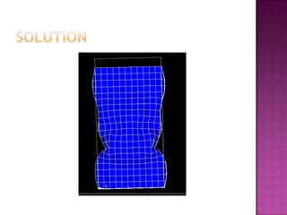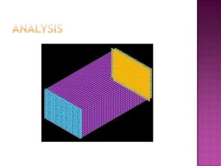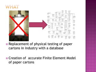 The document discusses creating an accurate finite element model of paper cartons to replace physical testing. It involves creating the finite element model, conducting physical testing for validation, simulating loads, and validating results. Material properties are tested and used to refine the finite element model. Simulation results are compared to physical testing which show good agreement within 10% for force and 4mm for peak displacement. The finite element model is found to be reliable with potential for improving the modeling of creasing phenomena.
