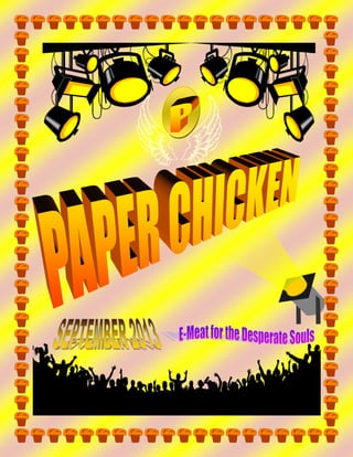 The document is an issue of the Paper Chicken e-magazine. It welcomes readers back and says the magazine has improved by becoming healthier and tastier. It encourages readers to explore each page for fun and information. It also promotes reading the story about a chicken and pig at the end. The rest of the document provides statistics about India's growing poultry and egg industries, with India becoming a top global producer. It also includes interviews with a marketing professor about her favorite chicken dishes and thoughts on chicken consumption.