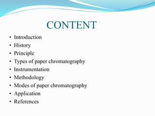 Paper chromatography is a technique used to separate mixtures based on differences in how components partition between a stationary phase (filter paper) and mobile phase (solvent). It involves applying a sample to a strip of paper and developing it by allowing the solvent to travel up the paper. This causes the different components to separate into bands at different distances based on how strongly they are retained by the paper. Paper chromatography is widely used for qualitative analysis and identification of organic and inorganic compounds in mixtures.