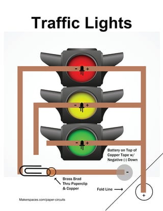 This document contains instructions for creating several paper circuits, including: 1) A parallel circuit with copper tape, a battery, and an LED light that will light up when the battery is connected. 2) A doorbell circuit using a LilyPad button board, switch, buzzer, and battery to create a circuit that will make a buzzing noise when the button is pressed. 3) A flap or tab switch circuit that uses a piece of paper with copper contact and a battery to create a simple on/off switch that turns the circuit on when the flap is pressed down.