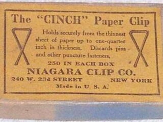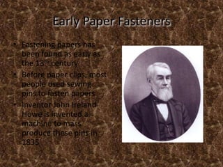 Paper clips have been used to fasten papers since the 13th century, though many early versions used sewing pins. The modern paper clip design was patented in the late 19th century by several inventors including George McGill. A middle school teacher had students collect over 6 million paper clips to represent Jews killed in the Holocaust, resulting in a documentary and book about the project. The common paper clip design was patented in 1899 and became widely popular.