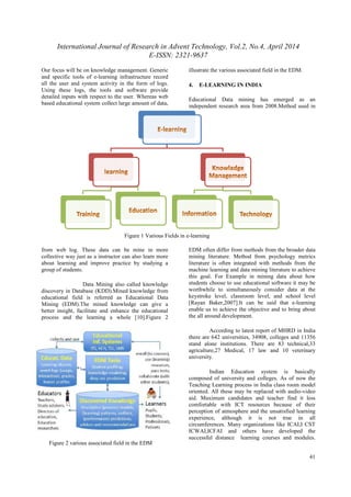 This document discusses the relationship between information and communication technology (ICT) and e-learning, with a focus on how data mining can be used in the context of e-learning. It first provides background on e-learning and how ICT has enhanced e-learning through technologies like web 2.0. It then discusses how educational data mining uses data collected by e-learning systems and tools to gain insights about students, learning, and how to improve practices. Specific techniques like analyzing keystroke data and data at different levels can provide valuable information. The document concludes that data mining techniques applied by education experts can help address open challenges in e-learning systems and help transform education in India.