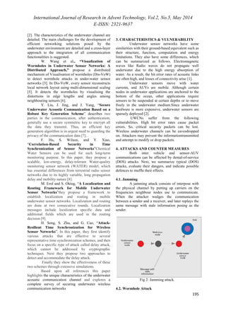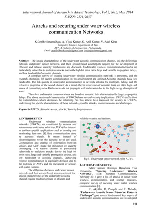 This document discusses security challenges in underwater wireless communication networks (UWCNs). It provides an overview of the characteristics of underwater acoustic channels that make UWCNs vulnerable to attacks, such as high bit error rates and low bandwidth. Several common attacks on UWCNs are described, such as jamming, wormhole attacks, and selective forwarding. The document also outlines security requirements for UWCNs, including authentication, confidentiality, integrity, and availability. It provides a survey of existing literature on securing UWCNs and discusses open challenges in providing security for these networks.