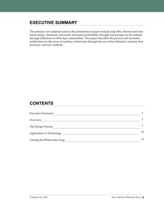 This document outlines the economic benefits and processes involved in the reuse of paper machine whitewater, emphasizing the importance of fine-filtration and industry best practices. By reusing machine whitewater, mills can minimize fresh water usage, reduce energy costs, and recover valuable fiber, enhancing overall efficiency and profitability. The paper highlights various water sources, treatment costs, and technology applications necessary for an effective whitewater reuse system.