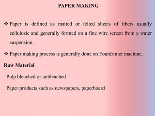 The document discusses the process of paper manufacturing, including preparing pulp from raw materials, forming a wet sheet using a Fourdrinier machine, and drying the sheet through a series of rolls and cylinders to produce a finished paper product containing 5-6% water that can be wound, cut, coated and packaged. Fillers, sizing, and coloring agents may be added to the pulp slurry before forming the sheet to modify the properties of the finished paper. Water is removed at various stages of the process and recycled.