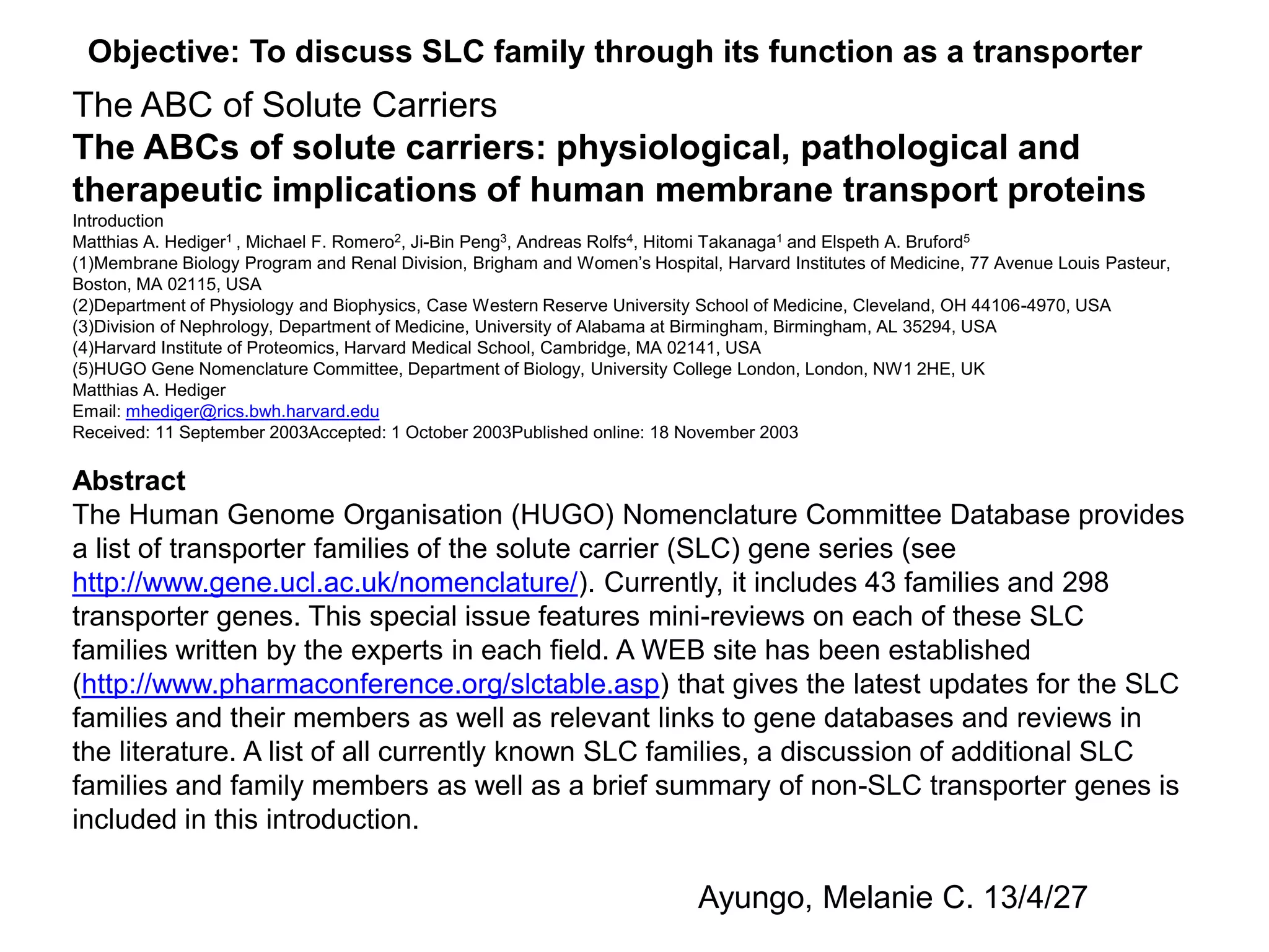 The document discusses the solute carrier (SLC) gene families which encode membrane transport proteins. It notes that the Human Genome Organisation database currently lists 43 SLC families and 298 transporter genes. SLC transporters play important physiological roles as gatekeepers of cells and organelles, and in controlling the uptake and efflux of compounds. They can be classified as passive or active transporters. The SLC series genes are named using the root symbol SLC followed by a family number and individual transporter number. SLC transporter defects can cause human diseases, and several transporters are also important from a pharmaceutical perspective as potential drug targets or delivery systems.