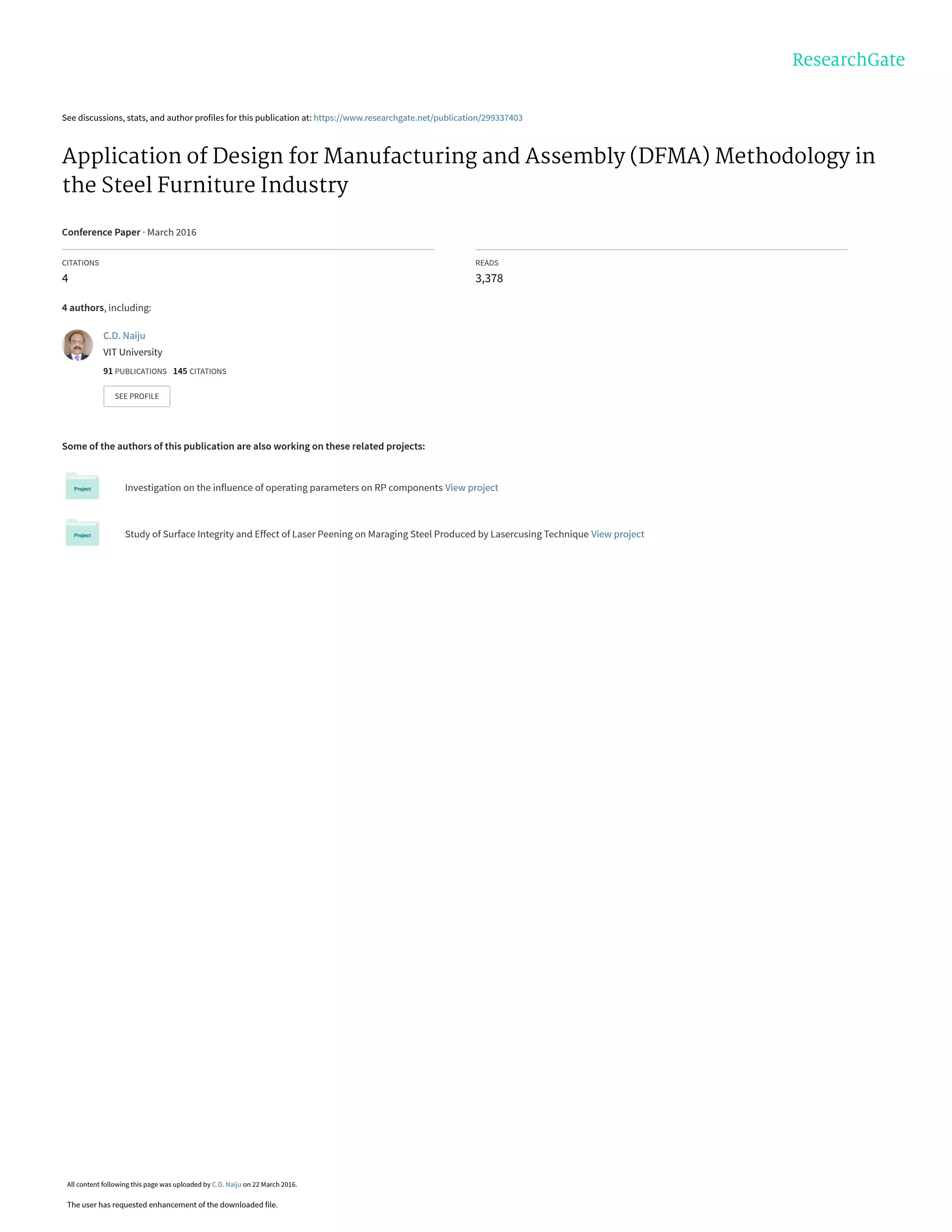 This document summarizes the application of Design for Manufacturing and Assembly (DFMA) methodology to reduce costs in the steel furniture industry. It presents two case studies where DFMA was applied: a folding chair and bunk bed. For the folding chair, the redesign reduced parts from 9 to 3, lowering costs from Rs. 675 to Rs. 607 per unit. For the bunk bed, parts were reduced from 29 to 9 and total costs lowered from Rs. 4530 to Rs. 3630. DFMA principles like reducing parts, optimizing for ease of assembly and manufacture, and material selection can significantly lower product costs when applied early in the design process.