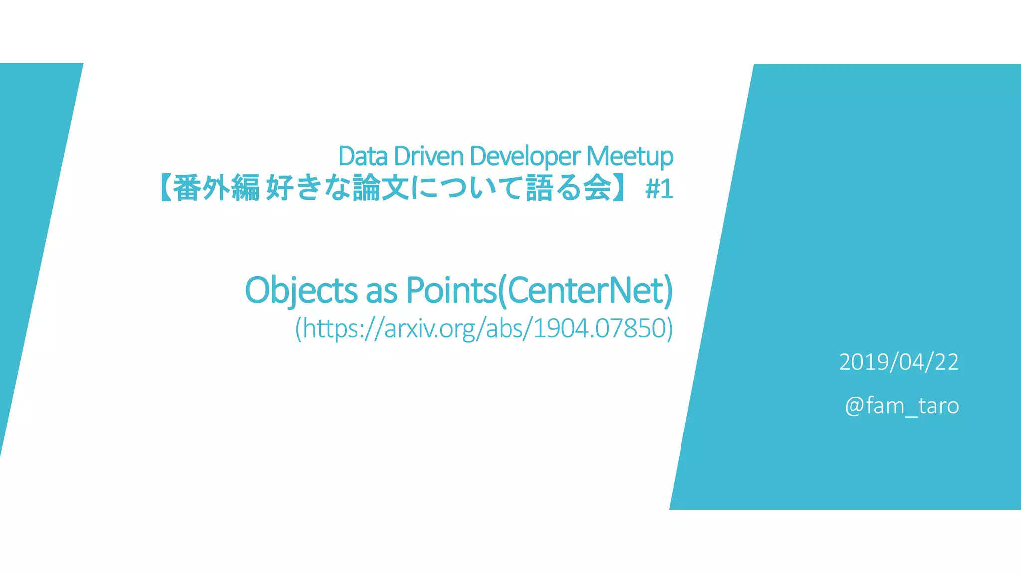 DataDrivenDeveloperMeetup 【番外編好きな論文について語る会】#1 Objects as Points(CenterNet) (https://arxiv.org/abs/1904.07850) 2019/04/22 @fam_taro