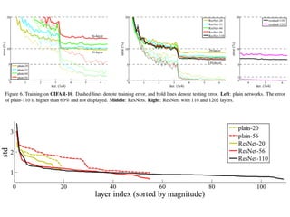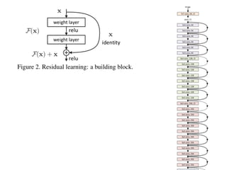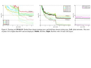 The document discusses deep residual learning for image recognition, detailing the evolution of neural network architectures and their performance on various benchmarks such as ILSVRC and MS COCO. It emphasizes the challenges of vanishing gradients and degradation problems with increased depth, proposing identity connections to mitigate these issues. The findings indicate that ResNet architectures, particularly deeper variants, can achieve lower error rates and improved training accuracy by addressing the degradation problem effectively.