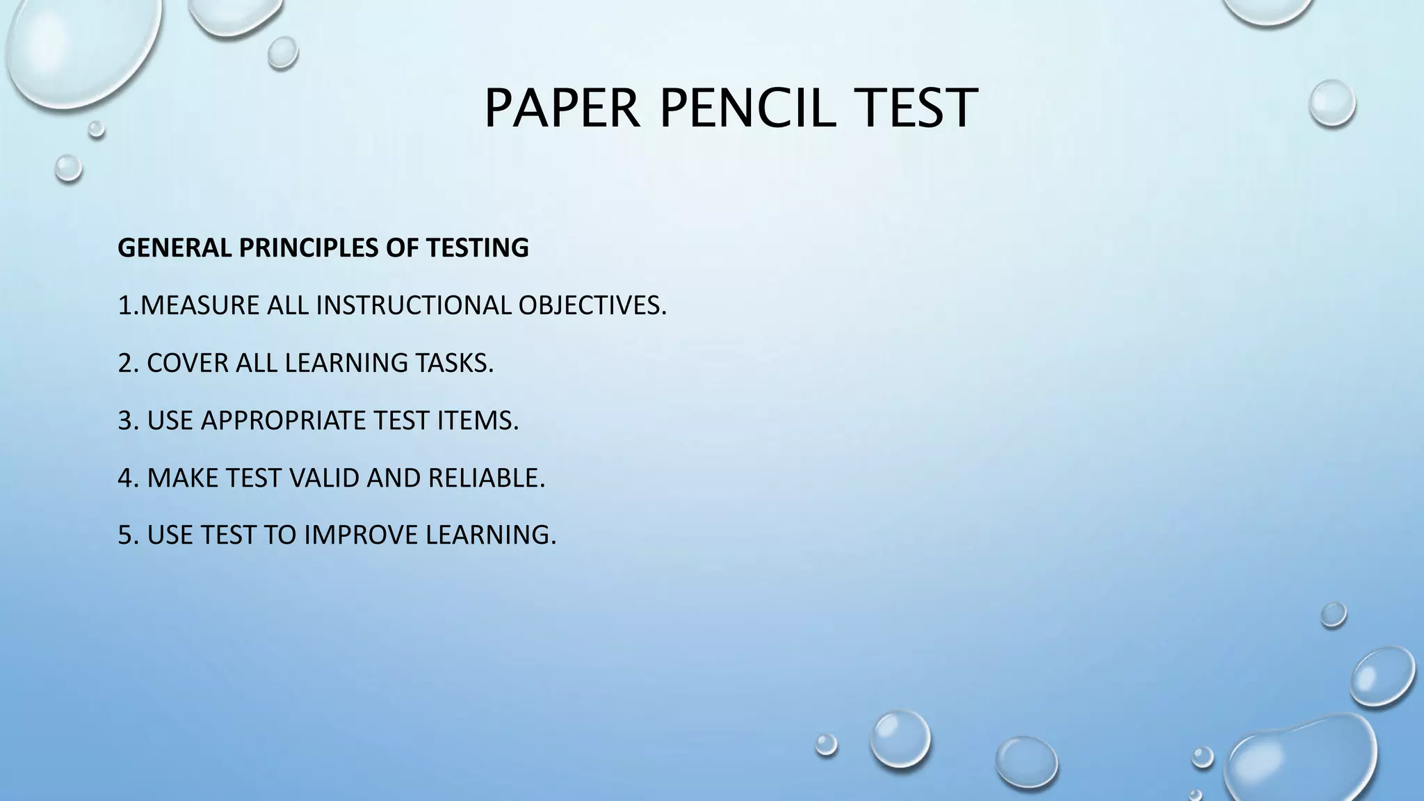 This document provides information about paper and pencil testing. It discusses general principles of testing like measuring objectives, covering learning tasks, using appropriate test items, and improving learning. It also describes the attributes of a good test in terms of validity, reliability, objectivity, scoring, and administration. Different types of test items are outlined, including selection items like multiple choice, true/false, matching, and completion questions as well as supply items like short answers and essays. Guidelines for writing test items and details about specific question types are provided.