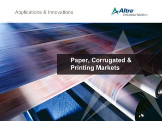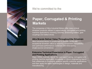 Altra Industrial Motion supplies critical drivetrain products for the paper, corrugated, and printing markets, ensuring component compatibility and performance optimization. The document highlights various applications, including clutch solutions for paper-making machines, custom couplings for machine upgrades, and maintenance-free solutions for corrugated equipment. Collaboration with OEMs allows for tailored engineering solutions to meet specific operational needs and enhance efficiency across diverse applications.