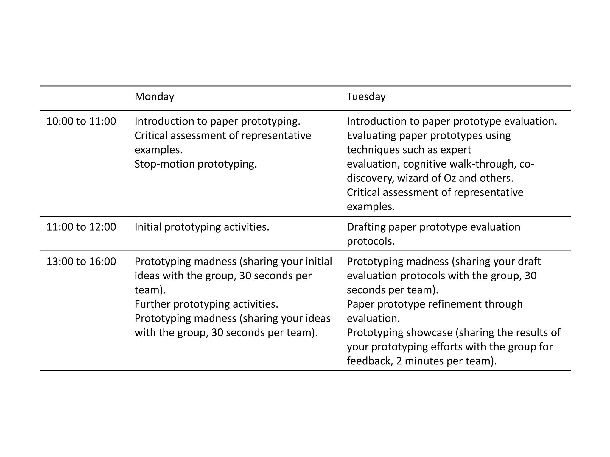 The document outlines a two-day paper prototyping workshop that includes activities such as introducing paper prototyping techniques, initial prototyping, further prototyping and refinement, and a final prototyping showcase. On the first day, participants will learn about paper prototyping and do initial prototyping activities. They will then further develop their prototypes and draft evaluation protocols. The second day involves additional prototyping, sharing ideas in short sessions, and refining prototypes through evaluation, culminating in a final showcase of results.
