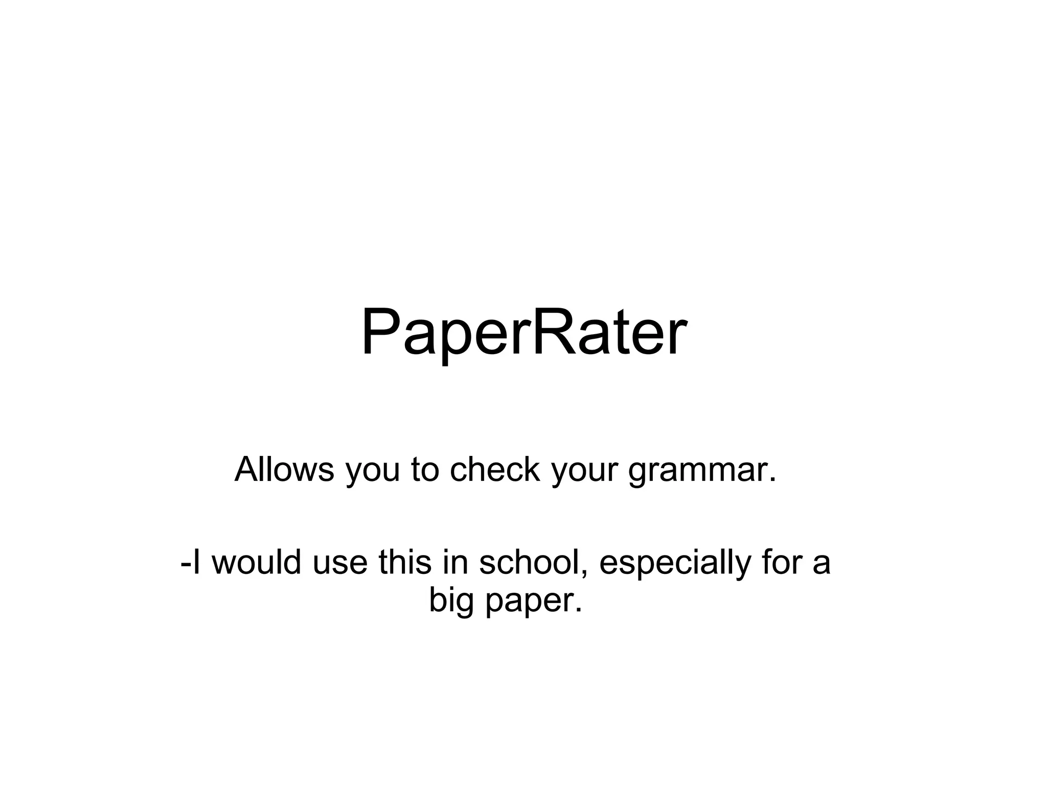 PaperRater allows you to check your grammar and punctuation. The writer suggests using PaperRater for school papers, especially for longer assignments. It can help catch errors and improve writing quality.