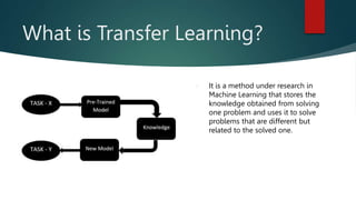 The document provides a review of transfer learning, a machine learning method that leverages knowledge from solving one problem to address related problems. It discusses various categories of transfer learning, including homogeneous and heterogeneous transfer, and explores its connections with semi-supervised, multiview, and multitask learning. Additionally, it highlights applications of transfer learning in fields such as medicine, bioinformatics, transportation, and recommender systems.