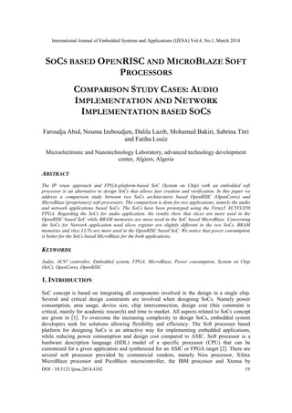 The IP reuse approach and FPGA-platform-based SoC (System on Chip) with an embedded soft processor is an alternative to design SoCs that allows fast creation and verification. In this paper we address a comparison study between two SoCs architectures based OpenRISC (OpenCores) and MicroBlaze (proprietary) soft processors. The comparison is done for two applications, namely the audio and network applications based SoCs. The SoCs have been prototyped using the Virtex5 XC5VLX50 FPGA. Regarding the SoCs for audio application, the results show that slices are more used in the OpenRISC based SoC while BRAM memories are more used in the SoC based MicroBlaze. Concerning the SoCs for Network application used slices register are slightly different in the two SoCs, BRAM memories and slice LUTs are more used in the OpenRISC based SoC. We notice that power consumption is better for the SoCs based MicroBlaze for the both applications.