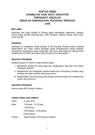 Sekolah Kebangsaan Puchong Perdana mengadakan sambutan Hari Raya Aidilfitri pada 6 Julai 2018 untuk merapatkan silaturrahim dalam kalangan warga sekolah. Program ini bertujuan membentuk sahsiah yang tinggi serta menghormati perayaan pelbagai kaum. Pelbagai jawatankuasa telah dilibatkan dalam pengurusan acara dan perbelanjaan dianggarkan berjumlah RM 6,820.