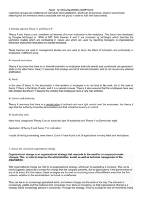 Next, it critically examines McGregor's Theory X and Theory Y of human motivation, contrasting their assumptions about internal motivation, attitudes towards work, control/authority, and leadership styles.