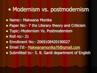 This document provides an overview of modernism and postmodernism in literature. It defines modernism as a movement from the late 19th to early 20th century that celebrated new styles and rejected realism. Postmodernism developed in the mid-20th century as a radical movement that questioned modernism and used a mixture of styles. Some key differences discussed are modernism's focus on the interior self versus postmodernism's exterior focus, and modernism's adherence to logic versus postmodernism's rejection of it. Examples of modernist and postmodernist authors and works are also provided.