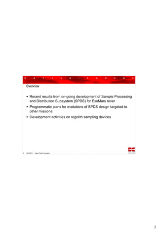 Kayser-Threde GmbH developed the Sample Processing and Distribution Subsystem (SPDS) for the ExoMars rover mission to handle and distribute rock and soil core samples from Mars. The SPDS includes mechanisms to transport samples from the drill to analytical instruments, crush samples into powder, dose powdered samples into containers for analysis, and position samples in front of instruments. Recent testing of the SPDS mechanisms together in ambient and simulated Mars conditions was successful in processing various rock and icy sample types and meeting requirements. Some improvements were identified for future designs, such as adding hammering to the crusher and increasing powder agitation. The SPDS development supports the 2018 ExoMars rover mission and sample handling for future planetary missions.