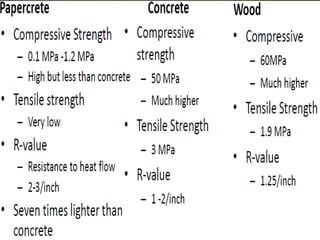Papercrete is a building material made from a mixture of shredded paper, water, and Portland cement. It can be poured into molds and sets into strong, lightweight blocks like concrete. Papercrete has insulating and sound absorbing properties that make it suitable for construction. While it is not structurally strong enough for load-bearing walls, papercrete can be used for inner walls and decoration. It is an environmentally friendly alternative to concrete that utilizes waste paper but lacks regulatory approval and its use at large scale could increase deforestation.