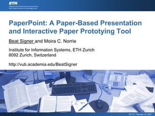 The document discusses PaperPoint, an interactive paper prototyping tool that combines paper presentations with digital content. Key features include non-linear presentations, collaboration, and the ability to create active components for interactive experiences. It also mentions various applications and technologies related to interactive paper, highlighting its potential for rapid prototyping and content authoring.