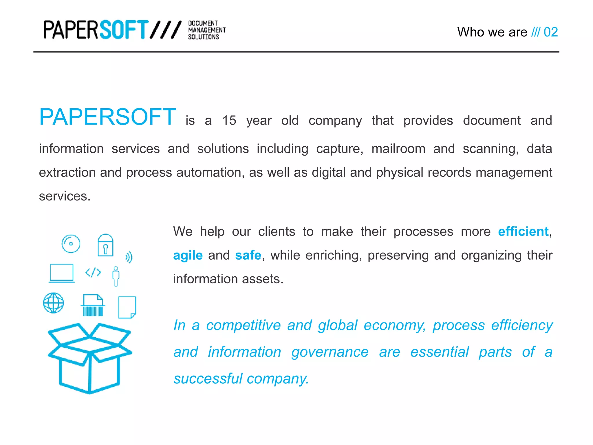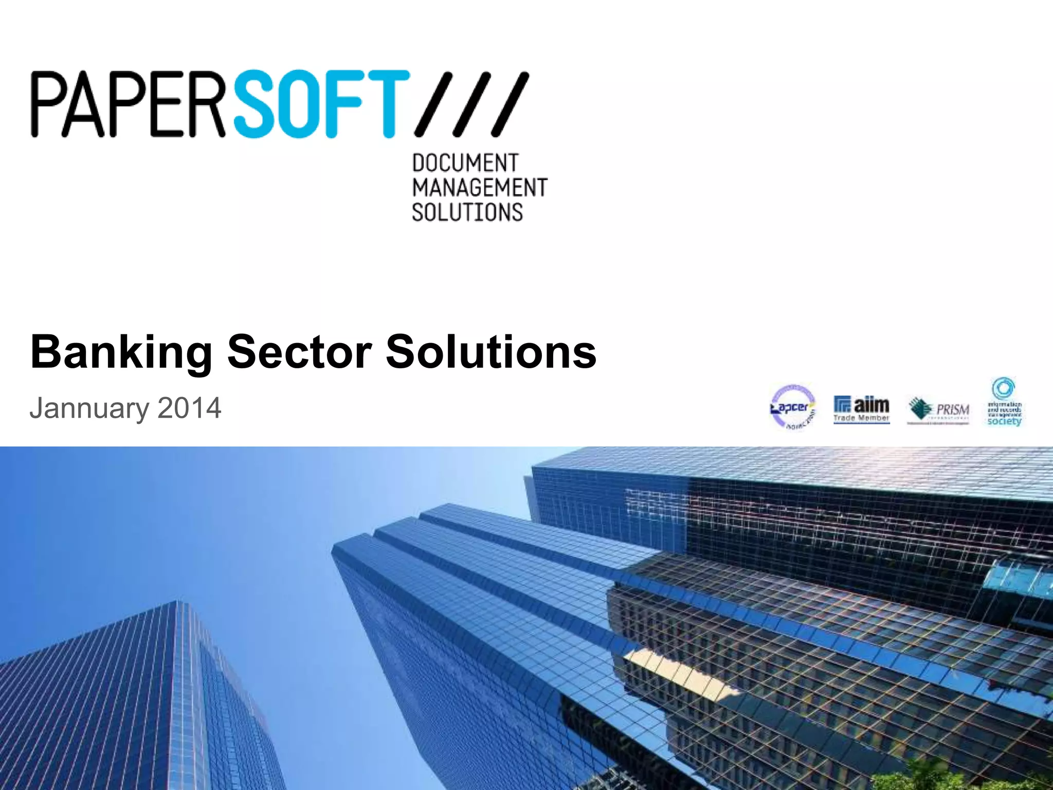 Papersoft, founded in 1999, offers document management solutions, specializing in process automation and information governance for the banking sector. The company addresses challenges such as regulatory compliance, data security, and inefficient manual processes, which can lead to high costs and data loss. Their solutions enhance data accuracy and processing efficiency, allowing banks to streamline operations and improve compliance.