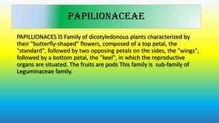 This document discusses the Papilionaceae plant family. It describes the structure of Papilionaceae flowers, which are characterized by their butterfly-like shape. The document outlines the economic importance of some crops in the family, including peas, soybeans, and peanuts. It proposes developing peanuts and cowpeas as new crops and describes traditional and potential commercial uses of peanuts and cowpeas that could make them economically viable.