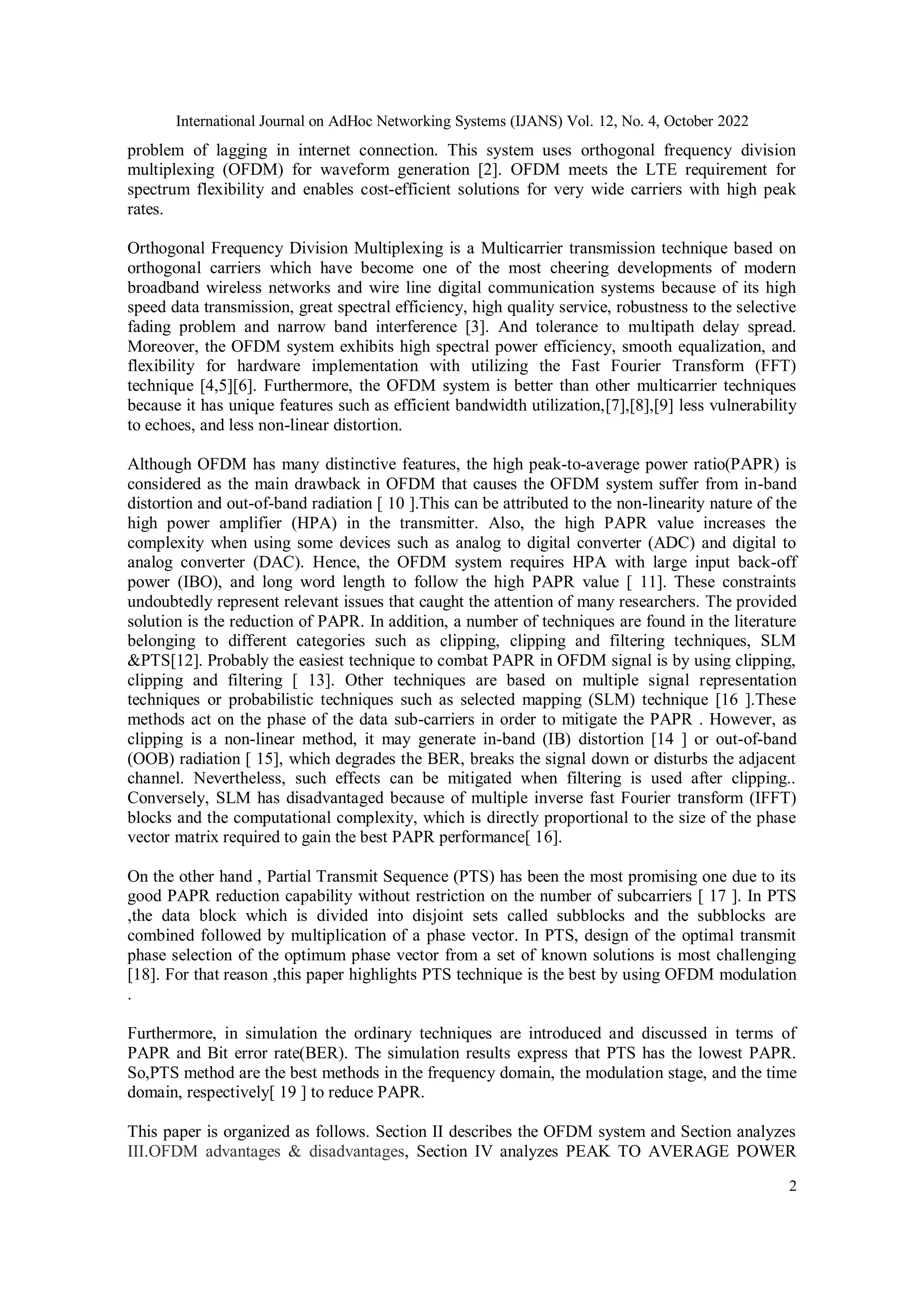 The document discusses various techniques to reduce the peak-to-average power ratio (PAPR) in Orthogonal Frequency Division Multiplexing (OFDM) systems within Long-Term Evolution (LTE) technology. It highlights the advantages of OFDM, such as high data rates and spectral efficiency, while acknowledging its drawback of high PAPR leading to inefficiencies and signal distortion. Among the proposed solutions, the Partial Transmit Sequence (PTS) technique is emphasized as effective for PAPR reduction without significant restrictions on subcarriers.