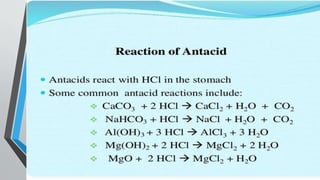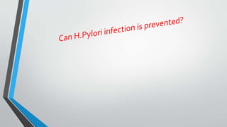 Peptic ulcers develop in the lining of the stomach, duodenum, or esophagus when acidic digestive juices damage the protective mucus layer. Common symptoms include stomach pain relieved by food or antacids. While acid contributes to ulcer formation, infection with H. pylori bacteria is now the leading cause. Treatment focuses on reducing acid with H2 blockers or proton pump inhibitors, eliminating H. pylori, and counseling lifestyle changes.