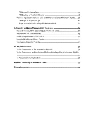 The document summarizes human rights violations documented by Human Rights Watch in Indonesia's Central Highlands region of Papua province between 2005-2006. It found that police, particularly mobile police units, regularly used excessive force during village raids to search for separatist guerrillas, resulting in killings, torture, and displacement of civilians. Even in routine policing, police often employed violence. Despite numerous serious abuses, only one low-ranking soldier was prosecuted, highlighting near-total impunity for security forces in the region. Restricted access and surveillance have made it difficult to monitor the situation and advocate for reform.