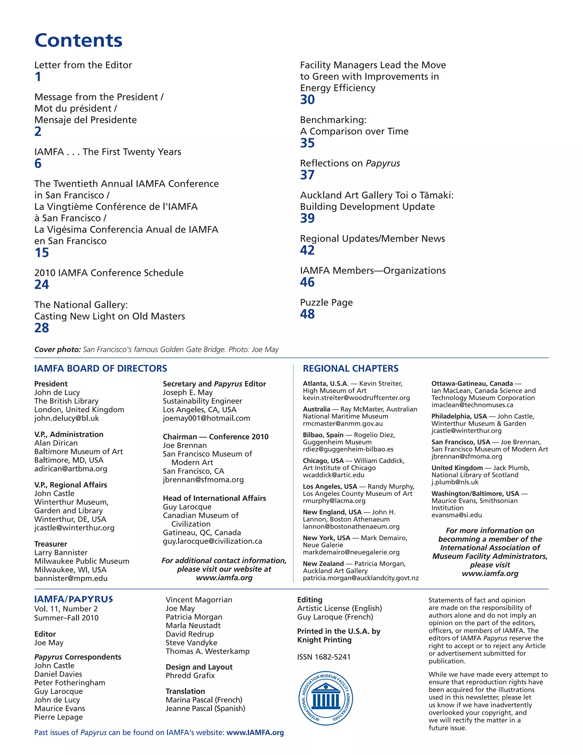 This document provides information about the 20th Annual IAMFA Conference taking place in San Francisco, CA. It includes a message from the IAMFA President highlighting some of the unique events planned for the conference, such as a California BBQ and walking across the Golden Gate Bridge. The conference agenda is packed with behind-the-scenes tours of local cultural institutions and educational programs. Members and their guests are encouraged to attend this conference, which promises fabulous weather and memorable experiences in San Francisco.