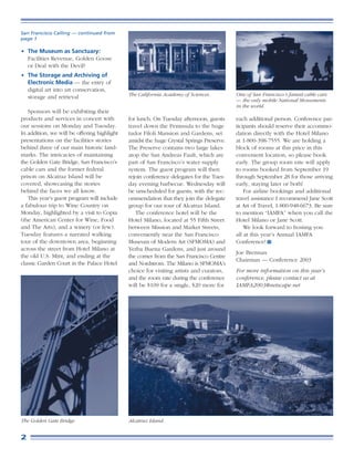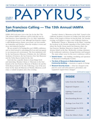 The document announces the 13th annual conference of the International Association of Museum Facility Administrators (IAMFA) to be held September 21-24, 2003 in San Francisco. The conference will take place at several museums around the city and will focus on issues like seismic safety, security, and the role of museums. Attendees can register for the full conference or individual days.