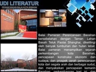 Dokumen ini membahas perancangan balai kota sebagai tempat pameran edukasi di Baoshan, Shanghai, dengan fokus pada desain yang ramah lingkungan dan futuristik. Balai pameran akan menggambarkan sejarah dan pencapaian kota serta menyediakan fasilitas untuk berbagai kelompok usia dan kebutuhan khusus. Selain itu, penekanan pada keberlanjutan dan teknologi tinggi dalam desain diharapkan dapat menciptakan ruang multifungsi yang mendukung edukasi, rekreasi, dan interaksi sosial.