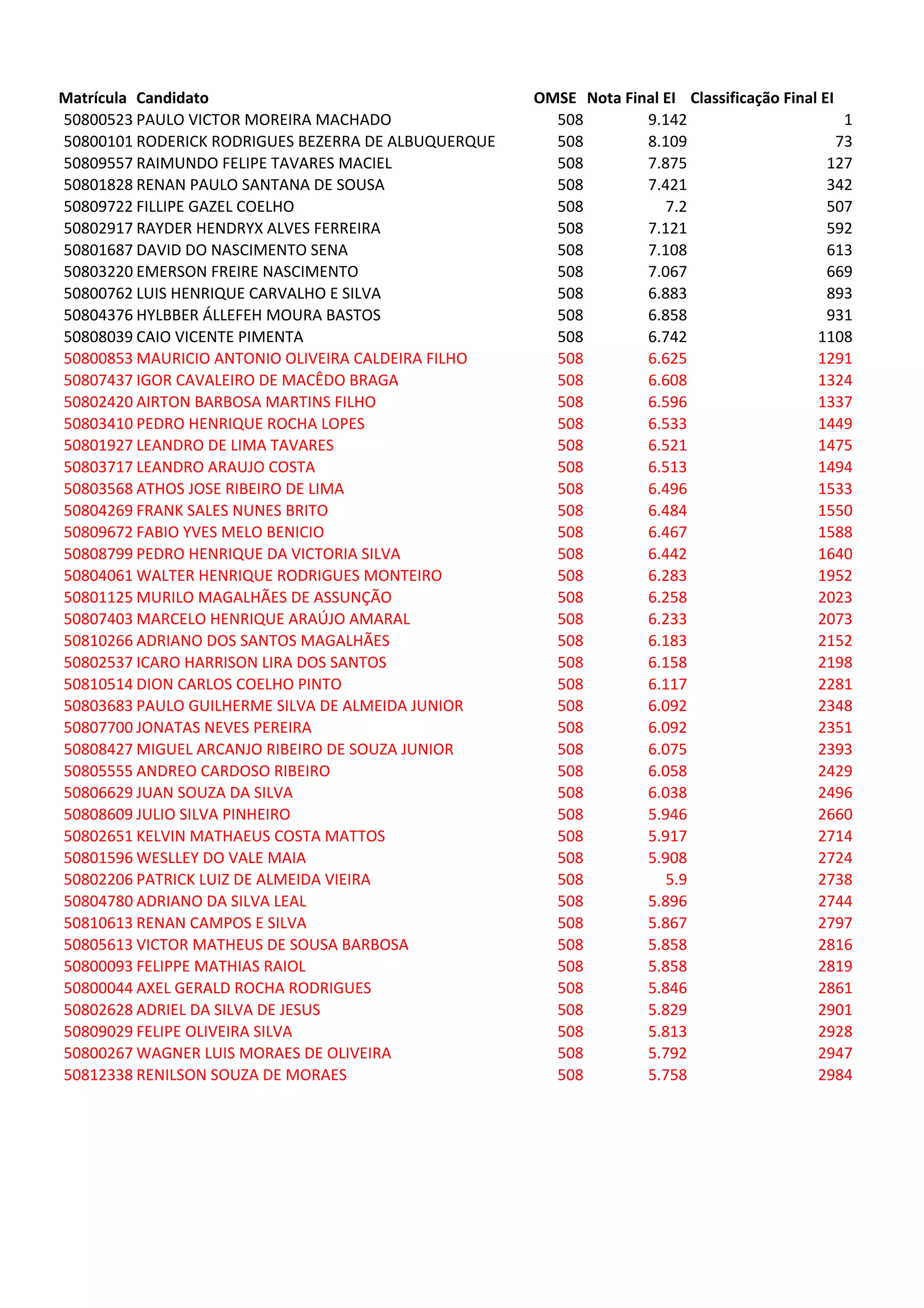Nota Final EI Classificação Final EI 50800523 PAULO VICTOR MOREIRA MACHADO 508 9.142 1 50800101 RODERICK RODRIGUES BEZERRA DE ALBUQUERQUE 508 8.109 73 50809557 RAIMUNDO FELIPE TAVARES MACIEL 508 7.875 127 50801828 RENAN PAULO SANTANA DE SOUSA 508 7.421 342 50809722 FILLIPE GAZEL COELHO 508 7.2 507 50802917 RAYDER HENDRYX ALVES FERREIRA 508 7.121 592 50801687 DAVID DO NASCIMENTO SENA 508 7.108 613 50803220 EMERSON FREIRE NASCIMENTO 508 7.067 669 50800762 LUIS HENRIQUE CARVALHO E SILVA 508 6.883 893 50804376 HYLBBER ÁLLEFEH MOURA BASTOS 508 6.858 931 50808039 CAIO VICENTE PIMENTA 508 6.742 1108 50800853 MAURICIO ANTONIO OLIVEIRA CALDEIRA FILHO 508 6.625 1291 50807437 IGOR CAVALEIRO DE MACÊDO BRAGA 508 6.608 1324 50802420 AIRTON BARBOSA MARTINS FILHO 508 6.596 1337 50803410 PEDRO HENRIQUE ROCHA LOPES 508 6.533 1449 50801927 LEANDRO DE LIMA TAVARES 508 6.521 1475 50803717 LEANDRO ARAUJO COSTA 508 6.513 1494 50803568 ATHOS JOSE RIBEIRO DE LIMA 508 6.496 1533 50804269 FRANK SALES NUNES BRITO 508 6.484 1550 50809672 FABIO YVES MELO BENICIO 508 6.467 1588 50808799 PEDRO HENRIQUE DA VICTORIA SILVA 508 6.442 1640 50804061 WALTER HENRIQUE RODRIGUES MONTEIRO 508 6.283 1952 50801125 MURILO MAGALHÃES DE ASSUNÇÃO 508 6.258 2023 50807403 MARCELO HENRIQUE ARAÚJO AMARAL 508 6.233 2073 50810266 ADRIANO DOS SANTOS MAGALHÃES 508 6.183 2152 50802537 ICARO HARRISON LIRA DOS SANTOS 508 6.158 2198 50810514 DION CARLOS COELHO PINTO 508 6.117 2281 50803683 PAULO GUILHERME SILVA DE ALMEIDA JUNIOR 508 6.092 2348 50807700 JONATAS NEVES PEREIRA 508 6.092 2351 50808427 MIGUEL ARCANJO RIBEIRO DE SOUZA JUNIOR 508 6.075 2393 50805555 ANDREO CARDOSO RIBEIRO 508 6.058 2429 50806629 JUAN SOUZA DA SILVA 508 6.038 2496 50808609 JULIO SILVA PINHEIRO 508 5.946 2660 50802651 KELVIN MATHAEUS COSTA MATTOS 508 5.917 2714 50801596 WESLLEY DO VALE MAIA 508 5.908 2724 50802206 PATRICK LUIZ DE ALMEIDA VIEIRA 508 5.9 2738 50804780 ADRIANO DA SILVA LEAL 508 5.896 2744 50810613 RENAN CAMPOS E SILVA 508 5.867 2797 50805613 VICTOR MATHEUS DE SOUSA BARBOSA 508 5.858 2816 50800093 FELIPPE MATHIAS RAIOL 508 5.858 2819 50800044 AXEL GERALD ROCHA RODRIGUES 508 5.846 2861 50802628 ADRIEL DA SILVA DE JESUS 508 5.829 2901 50809029 FELIPE OLIVEIRA SILVA 508 5.813 2928 50800267 WAGNER LUIS MORAES DE OLIVEIRA 508 5.792 2947 50812338 RENILSON SOUZA DE MORAES 508 5.758 2984