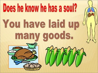A man asks Jesus to settle a family dispute over an inheritance. Jesus refuses, saying he was not appointed as a judge. He warns against greed and covetousness, saying one's life is not defined by material possessions. Jesus then tells a parable about a rich man with a bountiful harvest who plans to expand his barns to store more. Thinking he is set for life, the man brags about relaxing, but God says the man is a fool for not being rich toward God, as he dies that night. The parable teaches that true riches are not material but spiritual.