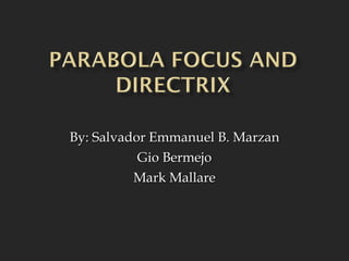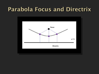 This document discusses finding equidistant points that form a parabola. It involves manipulating equations by squaring, expanding, transferring terms, simplifying, and multiplying/dividing to derive the goal equation that the distances from a fixed point to two varying points are equal, forming a parabola.