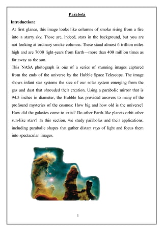 This document discusses parabolas and their key properties and applications. It begins by introducing parabolas as sets of points equidistant from a fixed line called the directrix and a fixed point called the focus. The standard form of a parabola equation is presented. Properties of parabolas including the vertex, axis of symmetry, focus, and directrix are described. Applications where parabolic shapes are used such as suspension bridges, vehicle headlights, and satellite dishes are also mentioned. Parabolas are widely used to model projectile motion and in optical systems where their reflective properties help focus or direct light.