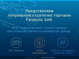 Документ описывает стратегию торговли с использованием индикатора Parabolic SAR, который предоставляет сигналы для открытия сделок на разворотах тренда. Успешные сделки рекомендуются на тайм-фрейме 15 секунд с временем сделки в 2 минуты, при этом важно реагировать на появление точек индикатора. Стратегия обещает до 90% прибыльных сделок и рекомендует определенные валютные пары и время торговли.