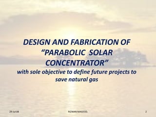 The document discusses the design and fabrication of a parabolic solar concentrator aimed at promoting solar energy usage in Pakistan. It highlights the importance of solar energy, its potential benefits for reducing reliance on fossil fuels, and presents an overview of solar concentrating collectors, particularly focusing on the parabolic trough design. The presentation also covers performance calculations and various applications such as electricity generation and water desalination.