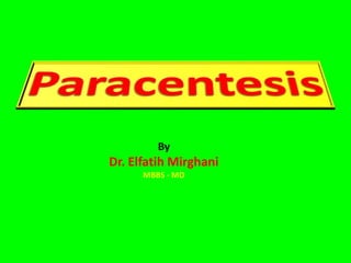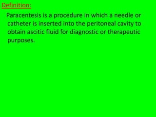 Paracentesis is a medical procedure used to obtain ascitic fluid from the peritoneal cavity for diagnostic or therapeutic purposes, with specific indications for diagnostic taps including new-onset ascites and suspected bacterial peritonitis. The procedure involves several steps, including consent, preparation, and fluid collection, along with sending samples for various laboratory tests to differentiate between types of ascites. Complications may arise, such as fluid leakage, hypotension, and infections, with causes for transudative and exudative ascites outlined.