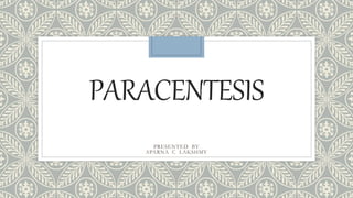 Paracentesis is a procedure to remove fluid from the abdominal cavity through puncturing the abdominal wall. It relieves pressure on abdominal and chest organs from fluid buildup. The key steps are preparing the patient, inserting a trocar and cannula below the umbilicus to drain fluid, and applying a dressing to the puncture site after removing sufficient fluid. The procedure aims to diagnose conditions causing fluid accumulation and reduce respiratory distress.