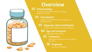 1) The document provides an overview of paracetamol (acetaminophen), including its history, pharmacokinetics, mechanism of action, toxicity, diagnosis, treatment, and prognosis.