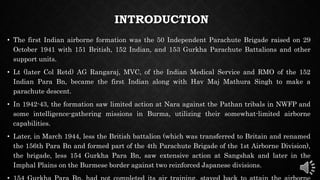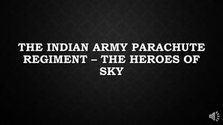 The Indian Army Parachute Regiment is known as the heroes of the sky. It was first formed in 1941 as the 50 Independent Parachute Brigade and saw action in Burma. Today it consists of 17 battalions including 9 special forces battalions. The regiment insignia is a silver parachute and their role is airborne and special forces operations. During Operation Vijay in 1999, 9 of the 10 parachute battalions were deployed to Kargil. The regiment has a history of bravery including extensive action in the Kashmir operations from 1947-1949.