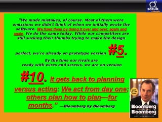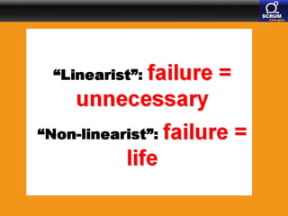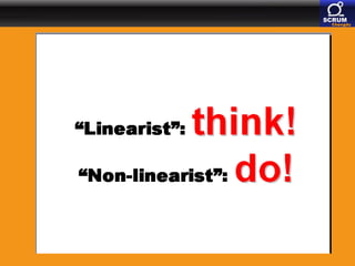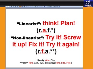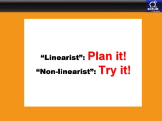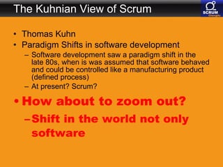 The document discusses paradigm shifts in software development, highlighting the evolution from traditional manufacturing-like processes to more adaptive methodologies like Scrum. It emphasizes the ideas of influential thinkers such as Henry Mintzberg, who critiques conventional management education and advocates for experiential learning. Additionally, it connects agile principles to the Chinese philosophy of Yin and Yang, suggesting that agile practices are shaped by balancing opposing elements in project management.
