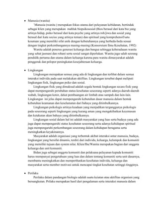 Dokumen ini menjelaskan paradigma kebidanan sebagai cara pandang bidan dalam memberikan pelayanan kesehatan, dengan fokus pada interaksi antara manusia, lingkungan, perilaku, dan keturunan. Pelayanan kebidanan meliputi berbagai asuhan yang bertujuan untuk meningkatkan kesehatan ibu, bayi, dan keluarga, serta mengkategorikan layanan kebidanan menjadi primer, kolaborasi, dan rujukan. Fokus utama adalah pada kualitas asuhan, berdasarkan etika profesi dan kebutuhan spesifik klien.
